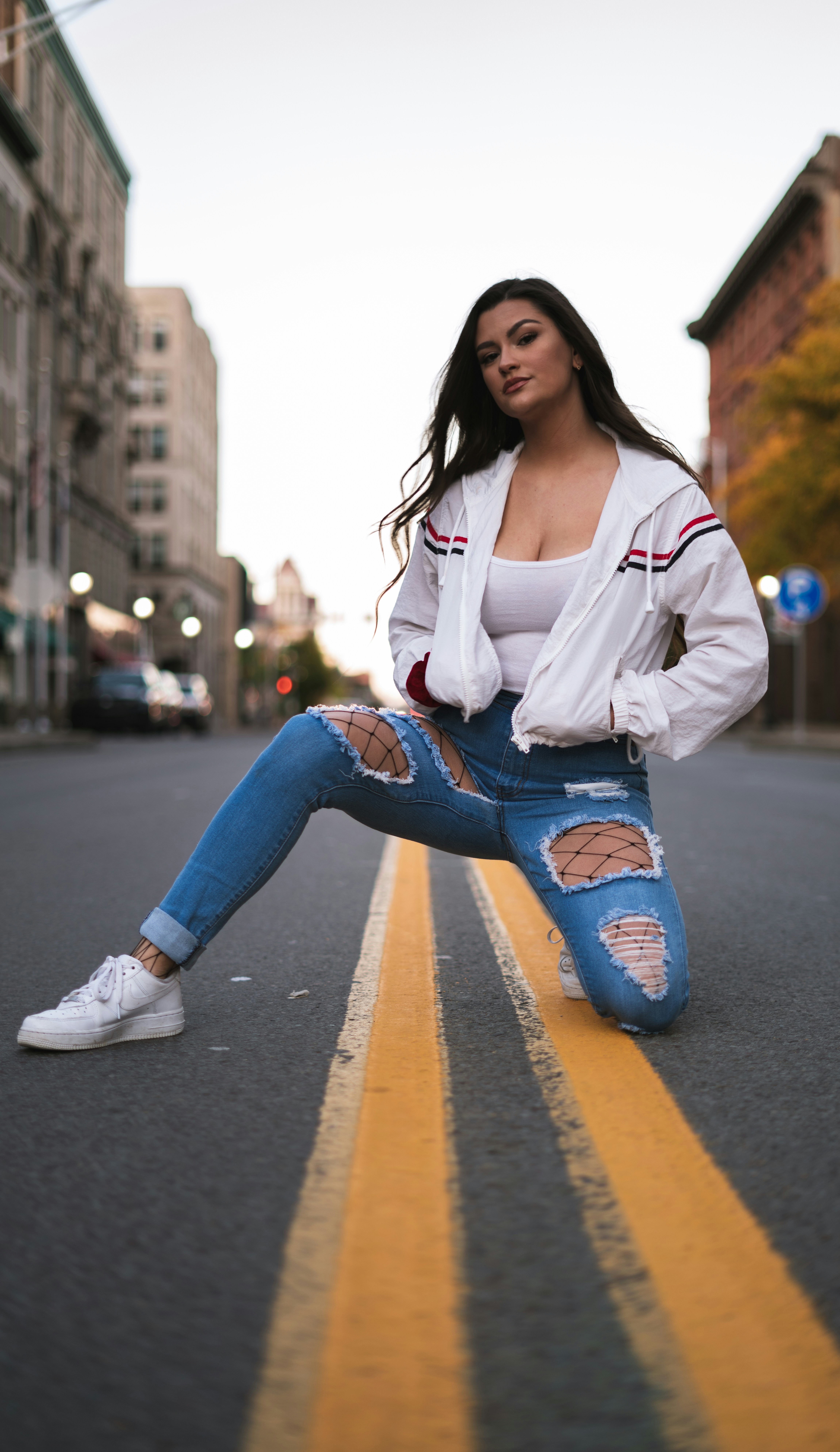 Woman In White Long Sleeve Shirt And Blue Denim Jeans Sitting On The Road During Daytime Photo Free Scranton Image On Unsplash